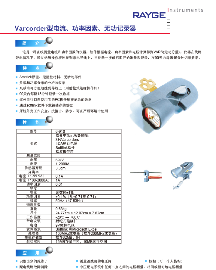 这是一种在线测量电流和功率因数的仪器,软件根据电流、功率因素和电压计算得到VARS(无功分量),仪器在线路带电情况下,通过绝缘操作杆连接到带电导线上,当仪器一接触后即开始测量和记录,在90天内每隔15分钟记录数据。